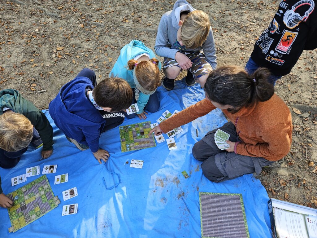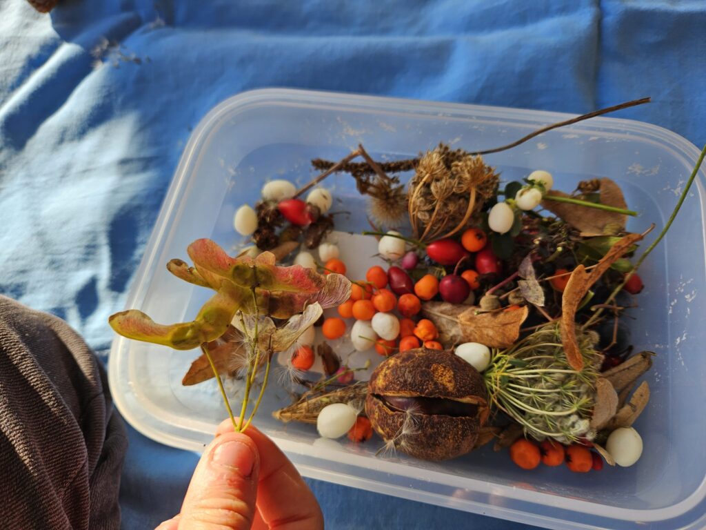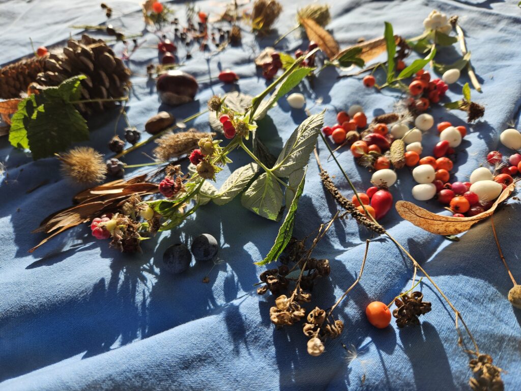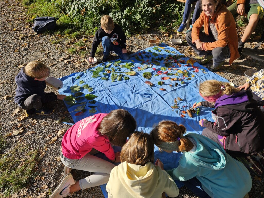 10 Kinder besammelten sich im Thoracker und begaben sich nach einem kurzen Kennenlernen in zwei Gruppen auf die Pirsch nach Samen und Beeren einerseits und Blättern andererseits. Am Waldrand breiteten wir all unsere Funde aus und bestaunten die unglaubliche Vielfalt, die die Natur uns bietet. Samen und Blätter dutzender Arten in verschiedensten Formen und Farben kamen zusammen. Die Kinder lernten, wie sich Samen ausbreiteten: Durch den Wind, über den Magen der Tiere und indem sie an Fell und Kleidung kleben bleiben, wie einige an ihren Trainerhosen unschwer feststellen konnten.