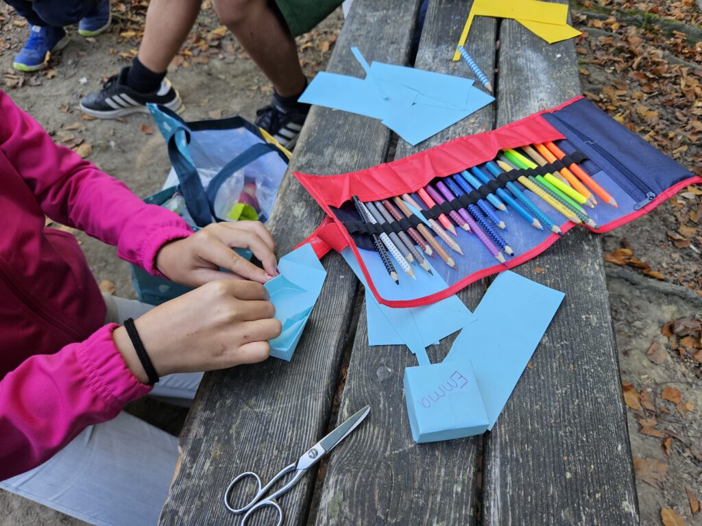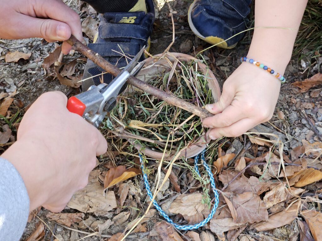 Im Wald wurden eifrig spielerisch Lebensräume für verschiedenste Tierarten gebaut. In drei Gruppen konnten die Kinder jeweils Kärtchen einer Tierart ziehen und mussten im Wald versteckte Plättchen mit den entsprechenden Lebensräumen suchen, die die Art jeweils benötigt. Nach dem Znüni ging es ans Basteln von Ohrengrüblerverstecken. Ein Blumentopf wurde mit Heu ausgestopft und mit einer selbst gedrehten Kordel zum aufhängen versehen. Dieses konnten sie zusammen mit einem selbst gebastelten Schächtelchen Wildsamen mit nach Hause nehmen.