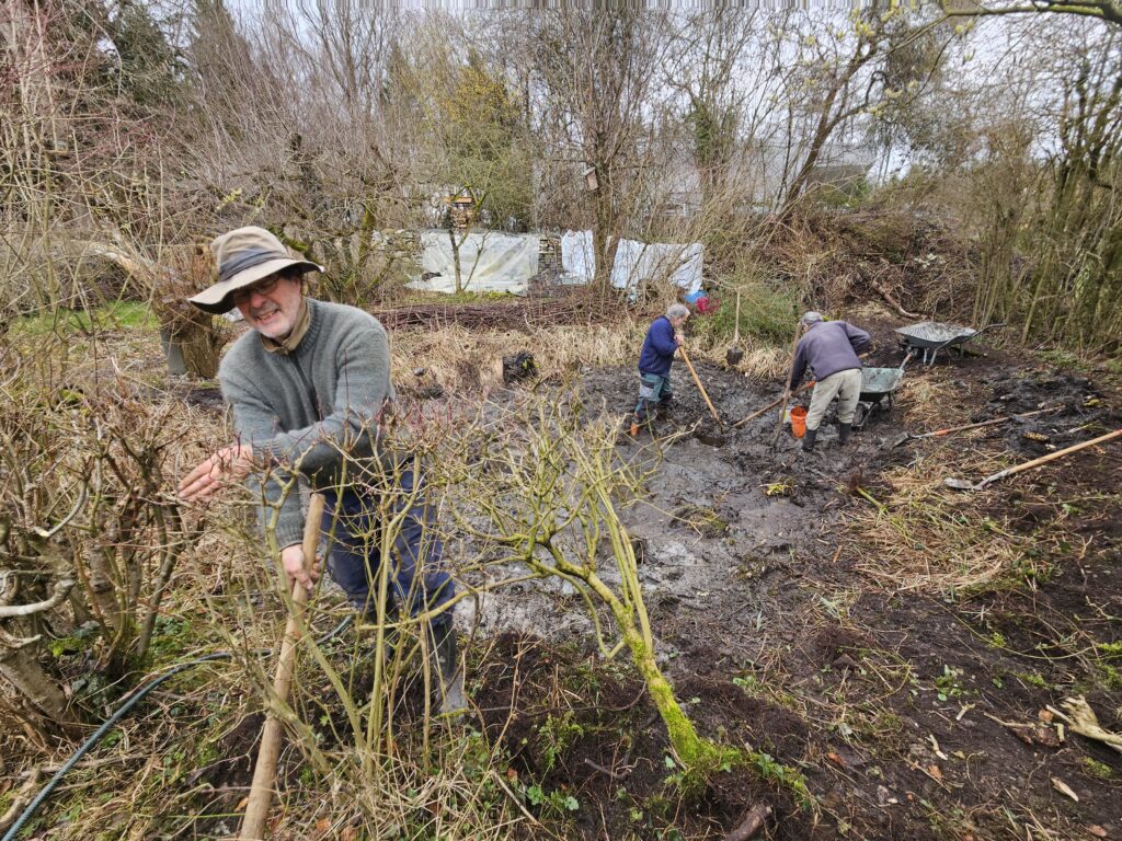 Danach ging das ganze Prozedere wieder von vorne los, einfach in die andere Richtung. Der Lehm wurde über die neue Folie in einer Stärke von rund 10 cm eingebracht und angepresst. Er dient wieder zum Schutz der Folie und soll einen möglichst natürlichen Untergrund herstellen. Steilere Uferpartien wurden mit Bollensteinen gesichert, flachere mit Sand und Kies bedeckt. Am Rand wurde der vorher ausgehobene, mit Sand und Kies durchsetzte Humus verteilt und die Ufervegetation wieder eingebracht. Zwischenzeitlich hatte auch Petrus seinen Anteil geleistet und etwas Wasser eingefüllt, was allerdings die Arbeit auf dem klebrigen Lehm nicht gerade erleichterte. Ein Teil des Heckenzauns wurde wieder gepflanzt, ein weiterer Teil wird mit einem Zaun aus naturbelassenen Ästen errichtet.