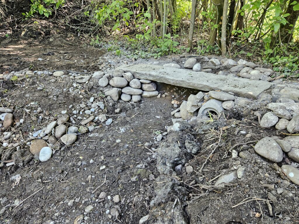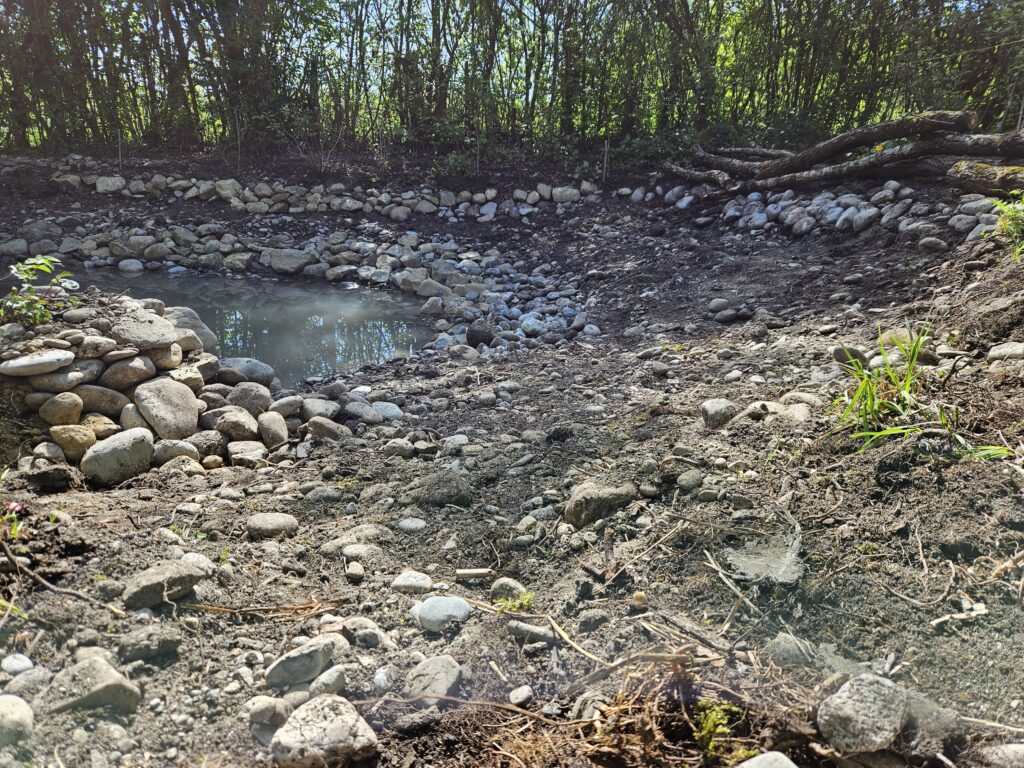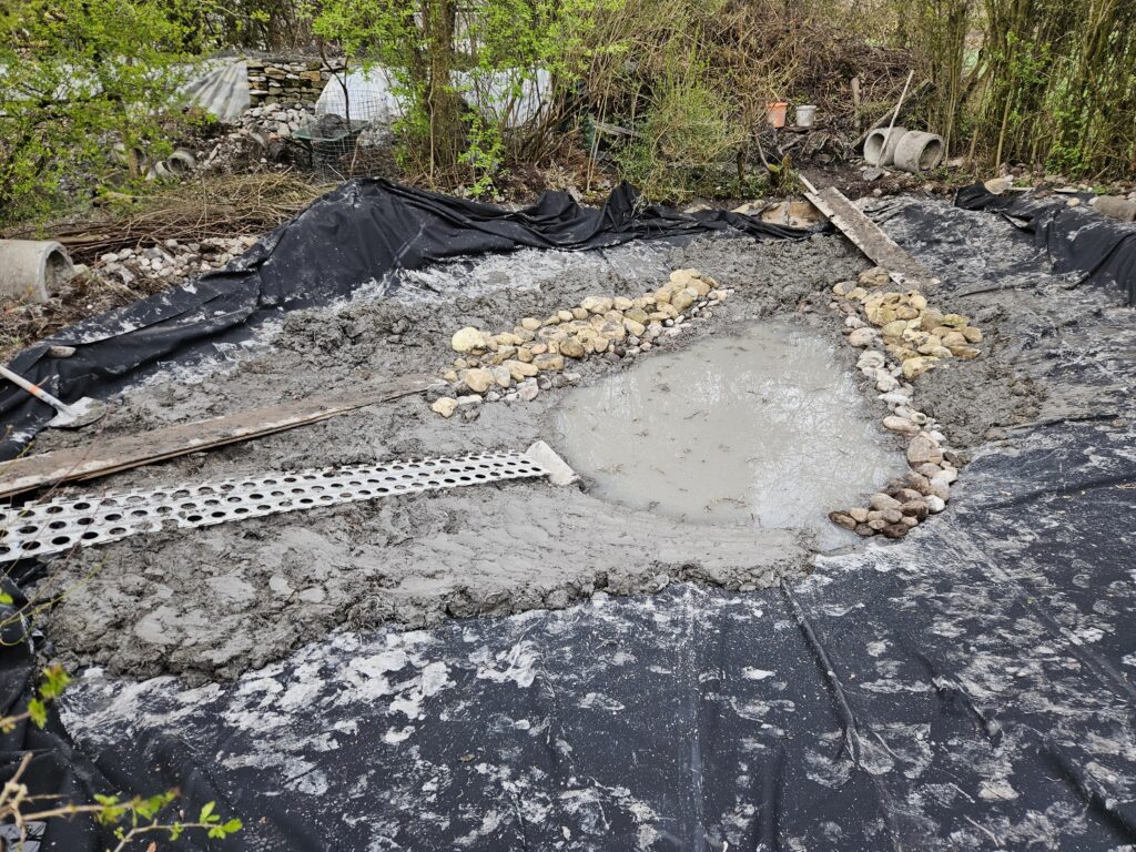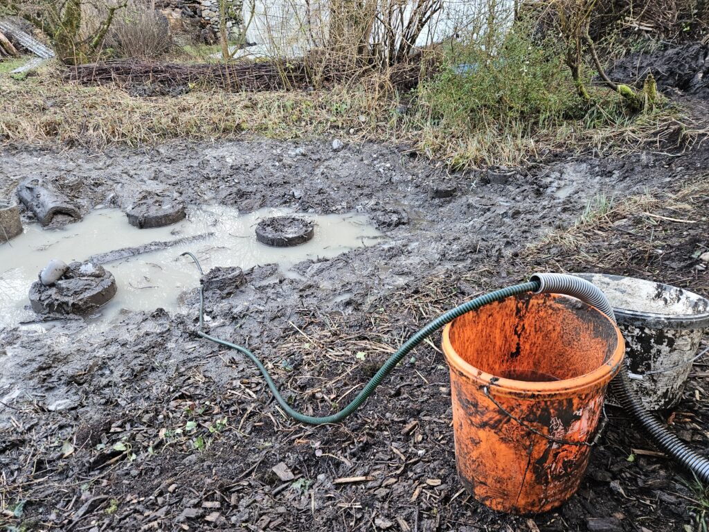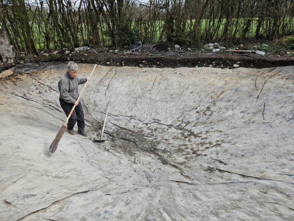 Der vergangene Sommer zeigte deutlich, dass mit dem Teich etwas nicht stimmt. Zeitweise wöchentlich musste Thomas Lüthi den Teich während Stunden wieder nachfüllen. Ansonsten wäre er ganz ausgetrocknet. Der Sommer war sicherlich extrem heiss und trocken. Trotzdem war klar, dass die Folie undicht sein muss. Es wurde beschlossen, den Teich im Frühling 2024 zu sanieren.