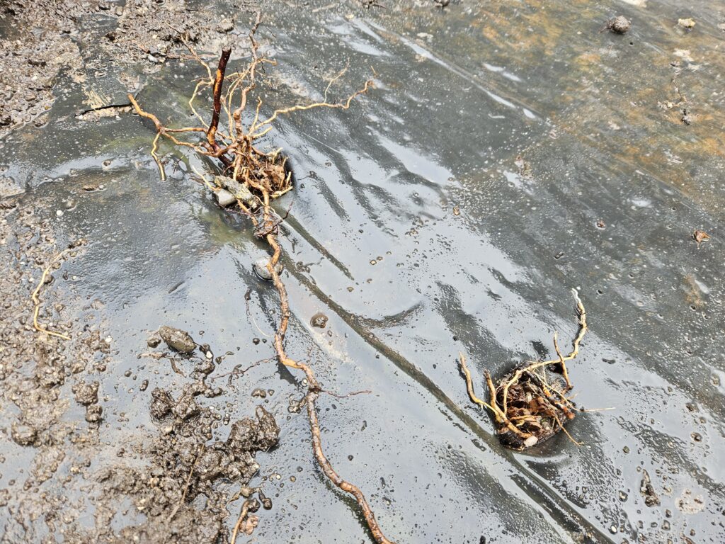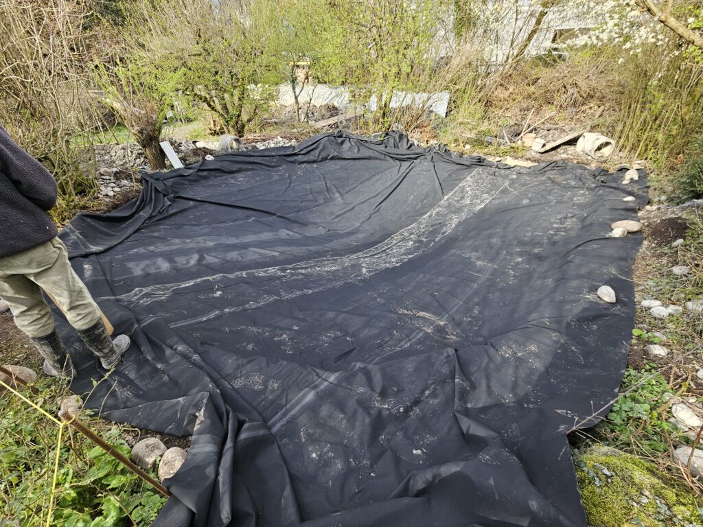 Am 13. März war es dann so weit. Zu viert machten wir uns an diesem ersten Einsatztag an die Arbeit. Zuerst musste der Schlamm dran glauben. Um an ihn heran zu kommen, musste das Restwasser abgepumpt werden. Dank des Lecks war nicht mehr viel Wasser drin. Dafür erschwerte das dichte Wurzelwerk der Teichrose und anderer Wasserpflanzen die Arbeit. Die kleine Hecke, die als Zaun an einer Seite des Teichs diente, wurde entfernt, der Humus ausgeschaufelt und in zwei Depots gelagert. Der Lehm, der auf die alte Folie eingebracht war, musste auch noch raus. Er wehrte sich zwar kräftig, wurde aber letztlich doch besiegt und rund 3m3 dieser klebrigen Masse konnten geborgen und zwischengelagert werden. Die alten Pflanzröhren mussten von Wurzeln befreit und rausgehoben werden. Nach drei Tagen lag die alte Folie nun frei. Sie wurde als Unterlage im Teich belassen und von Steinen gereinigt. Dann konnte die neue, rund 100 m2 grosse Folie eingebracht werden. Ein erster Meilenstein war am 23. März erreicht.