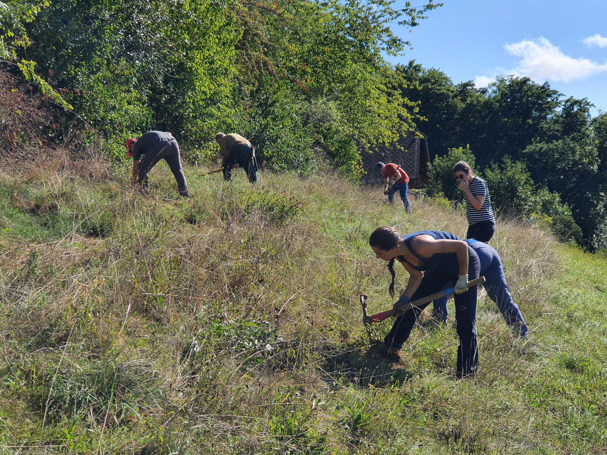 Wir machen einen Kontrollgang, ob noch Neophyten vorhanden sind. Je nach Zeit graben wir Brombeeren und Kratzbeeren aus, die in die untere Wiese wachsen.
